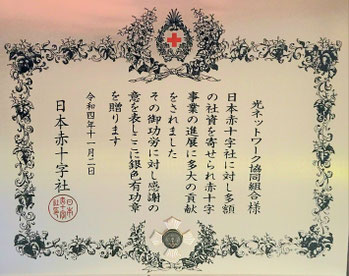 光ネットワーク協同組合は、去る令和4年11月2日に、日本赤十字社より銀色有功章を拝受いたしました。